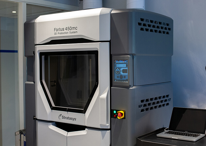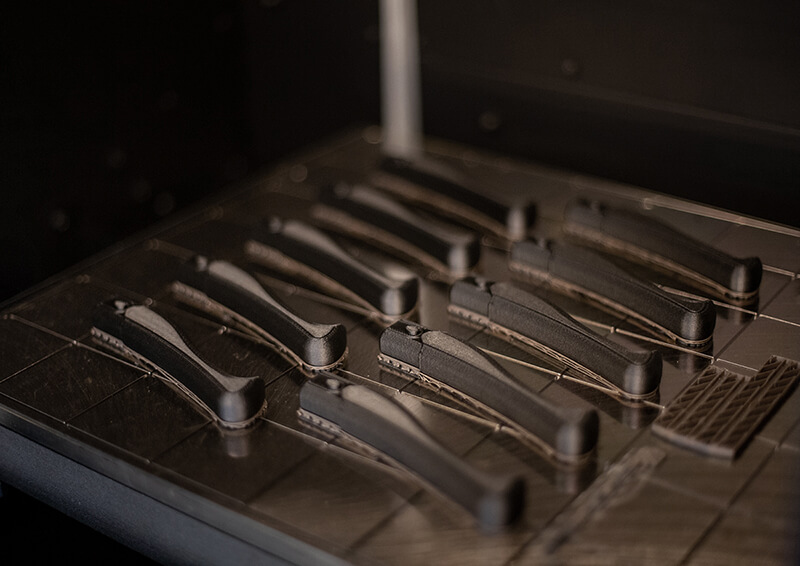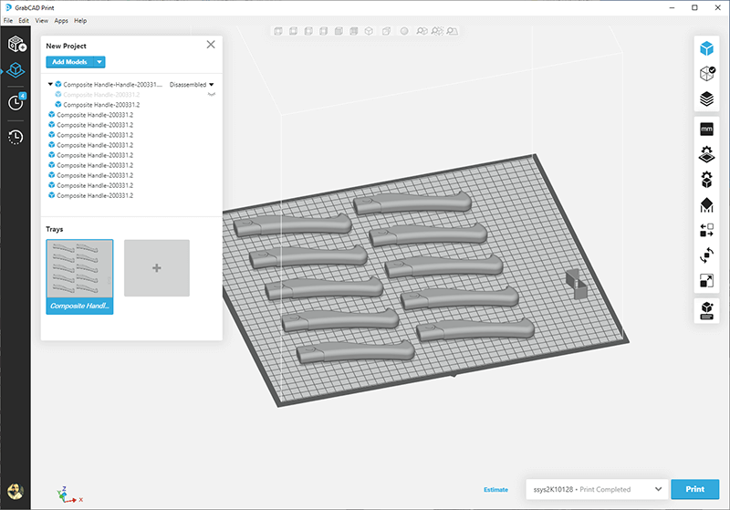 Handtagsdelen av det tvådelade handtaget konstruerades så att det kunde 3D-printas i kolfiberförstärkt Nylon (Nylon 12CF) i vår Stratasys 450mc 3D-skrivare. De mekaniska egenskaperna för materialet är enastående och detaljen gick att skriva ut med en invändig så kallad Lattice-strukture. Tio handtagsdelar fördelades på 3D-skrivarens byggyta och skrevs ut på 7 timmar och 36 minuter. En enstaka handtagsdel tog 1 timme och 10 minuter att skriva ut och hade en totalvikt på 25 gram.