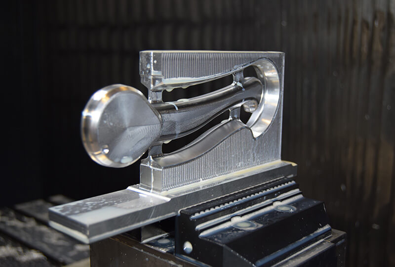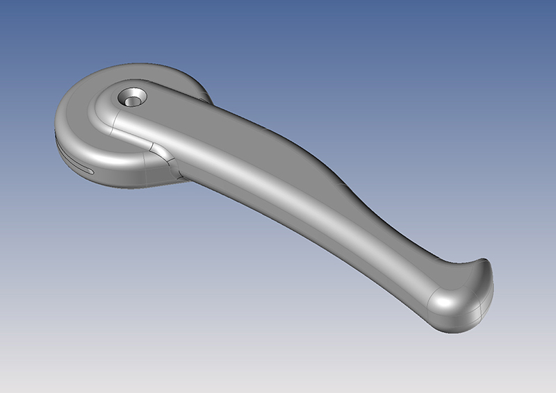 Vår partner ville att handtaget skulle ha en slät yta för att underlätta rengöring. Kravet gjorde att vi inte kunde göra produkten lätt genom ribbor och hål från utsidan på handtagsytan. Den första konstruktionen tog 12 timmar från skiss till färdig CAD-fil och utfördes i det integrerade CAD/CAM-systemet TopSolid’Design. Efter färdig konstruktion gjorde vi CNC-programmering i TopSolid’Cam och påbörjade bearbetningen. Det färdigfrästa handtaget blev riktigt bra men krävde en hel del manuellt arbete. Vi tog bort handtaget från fräsblocket, fixade till ytorna och blästrade sedan hela ytan. Det färdigfrästa handtaget vägde 187,5 gram.