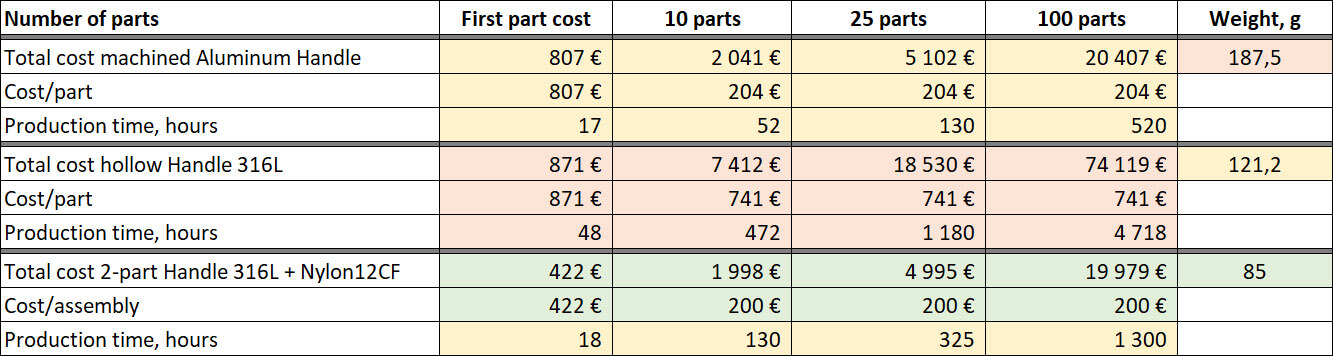 Efter att vi analyserat det frästa Aluminiumhantagets vikt och produktionskostnad ställde vi oss frågan – varför inte använda additiv tillverkning och tillverka ett ihåligt handtag i rostfritt stål? Kraven på handtaget var sådana att infästningsdelen av handtaget behövde vara i metall men inte nödvändigtvis i Aluminium.