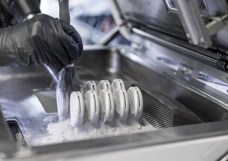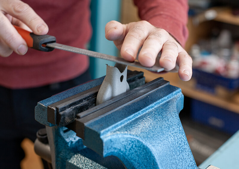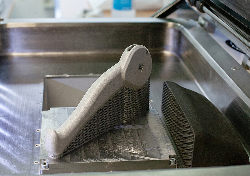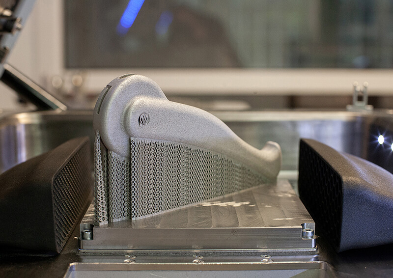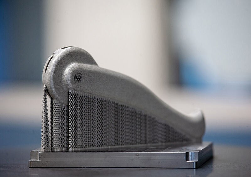 Infästningsdelen av handtaget konstruerades för att korta ner utskriftstid och behovet av stödstruktur. Tio infästningsdelar kunde packas på byggplattformen till vår Xact Metal XM200C och tog 125 timmar och 10 minuter att skriva ut. Borttagande av stödstruktur och färdigställande av varje detalj tog dock tid. Varje detalj blästrades sedan för att få en jämn ytstruktur. En infästningsdetalj tog 17 timmar att skriva ut och vägde 60 gram.