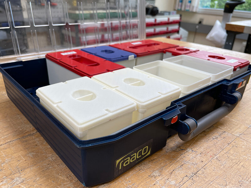 Sedan den första 3D-skrivaren köptes in har den blivit en integrerad del av produktutvecklingen. Tekniken möjliggör flera justeringar under processens gång eftersom nya iterationer kan tas fram snabbt och exakt. Oavsett om man utvecklar nya sortimentslådor eller förvaringssystem så målar och limmar Raaco sina prototyper efter behov så att de ser nästan identiska ut med den färdiga produkten. Därefter utförs funktionstester med de 3D-printade modellerna så att både ergonomi och funktion kan veriferas och godkänns innan den slutliga produktionsformen beställs.